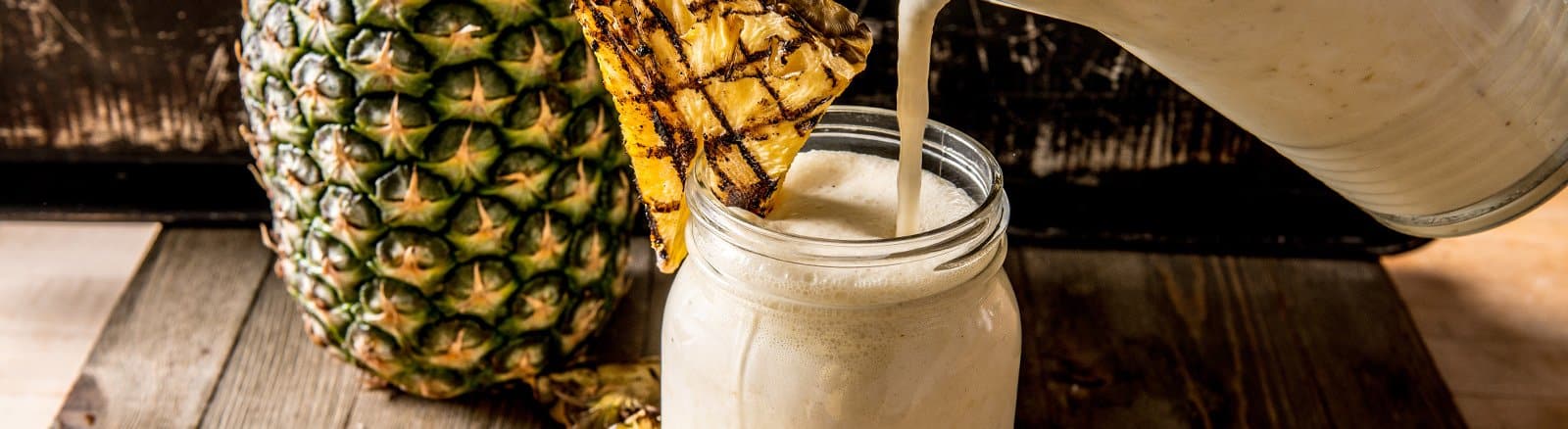 להשים 3/4 מפרוסות האננס לתוך בלנדר ולהוסיף חלב קוקוס, רום וקרח. להפעיל את הבלנדר עד שיוצא משקה אחיד.